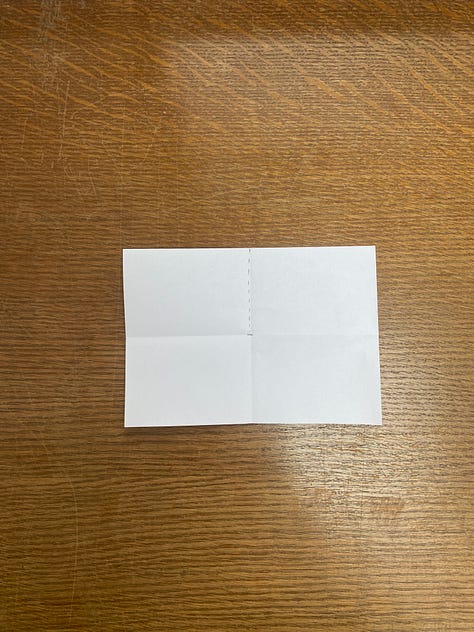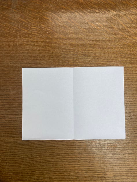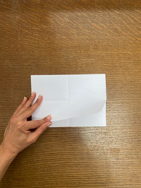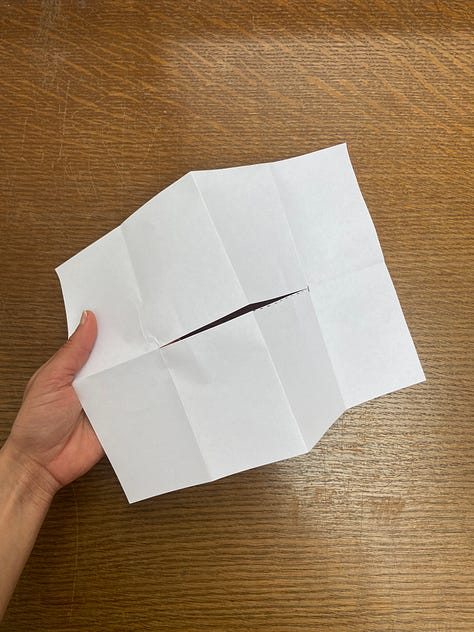 Fold the piece of paper in half, half again, and again! Next unfold it all out again, and fold in half with the open end facing you. Cut from the middle of the folded edge to the middle of the piece of paper (see the faint dotted line on image 7). Next, fold along the lengthways edge and push together to form the book.