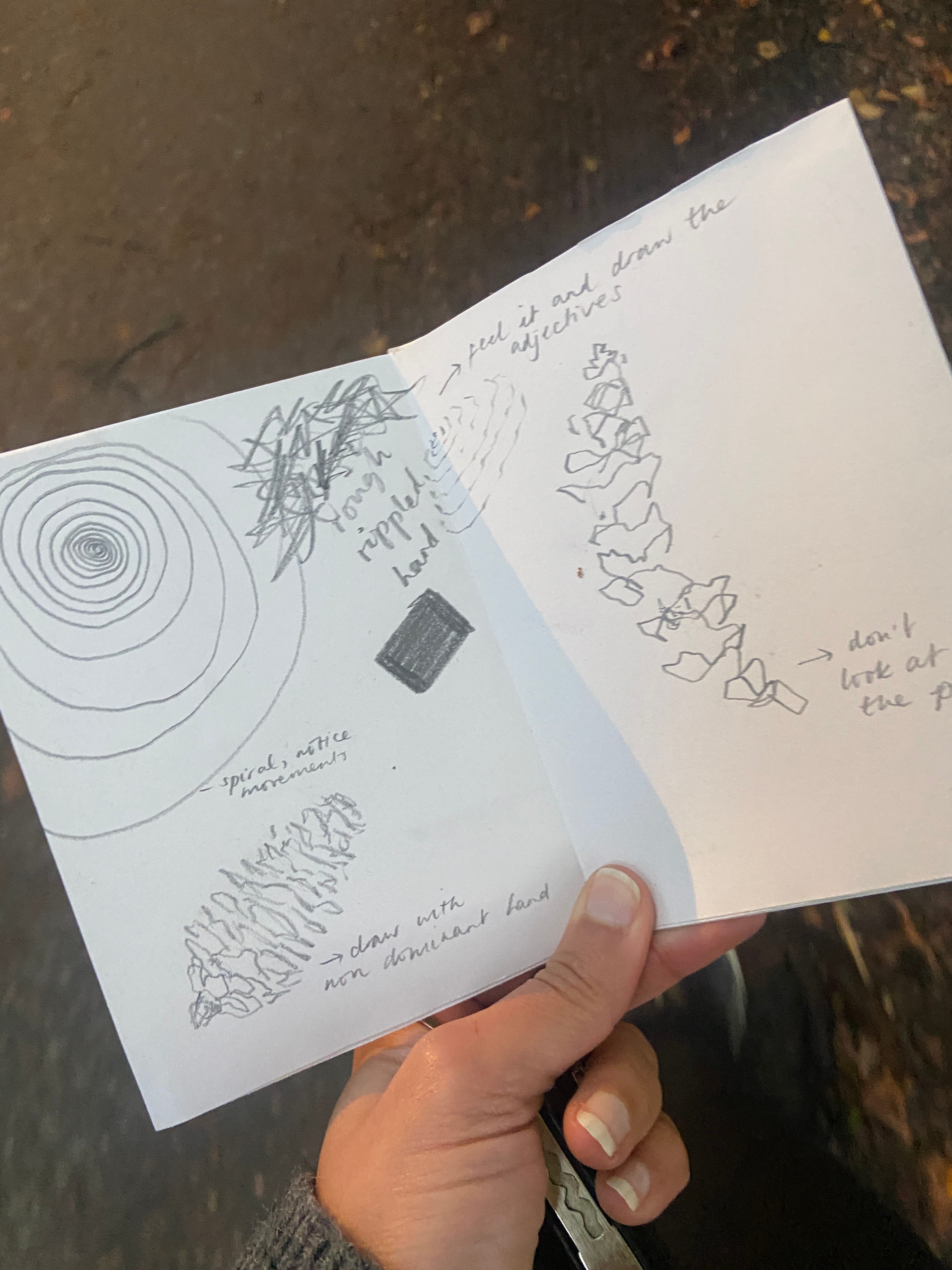 Finally, hold the pinecone behind your back and spend a minute feeling it, choose three adjectives, write them down and try to draw those adjectives!